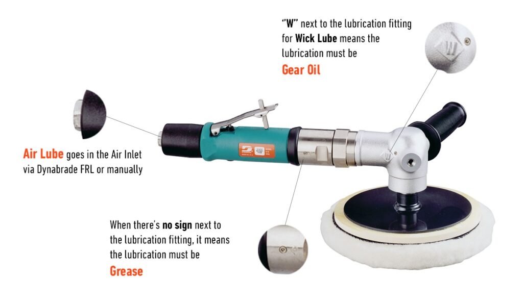 La lubricación de herramientas neumáticas Dynabrade es fundamental para su rendimiento, requiriendo principalmente aceite para aire (como el Dynabrade 95842) aplicado manualmente (3-4 gotas, 4 veces al día) o mediante un sistema FRL (Filtro-Regulador-Lubricador) para evitar óxido y lodos. También se usa grasa para engranajes en herramientas angulares.